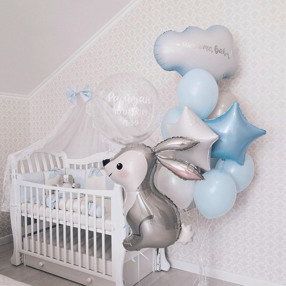 *фонтан из 8 шаров без рисунка + 2 фольгированные звезды + облачко + груз * заяц * прозрачный шар с надписью и перьями -