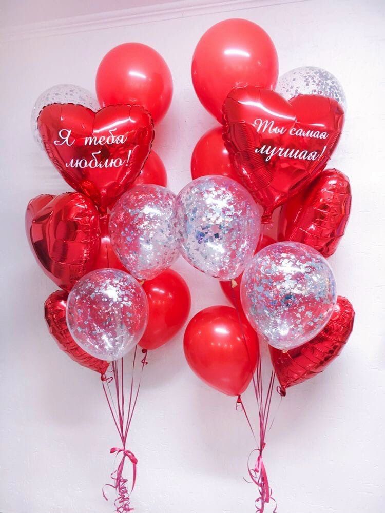 2 фонтана, в каждом 4 шара без рисунка, 3 с конфетти, 2 фольгированных 45 см без рисунка, 1 фольгированный 45 см с надписью + груз -